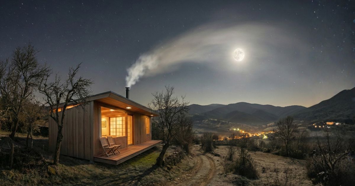田舎の夜、月明かりの下で焙煎所の煙がモクモクと上がっている…。